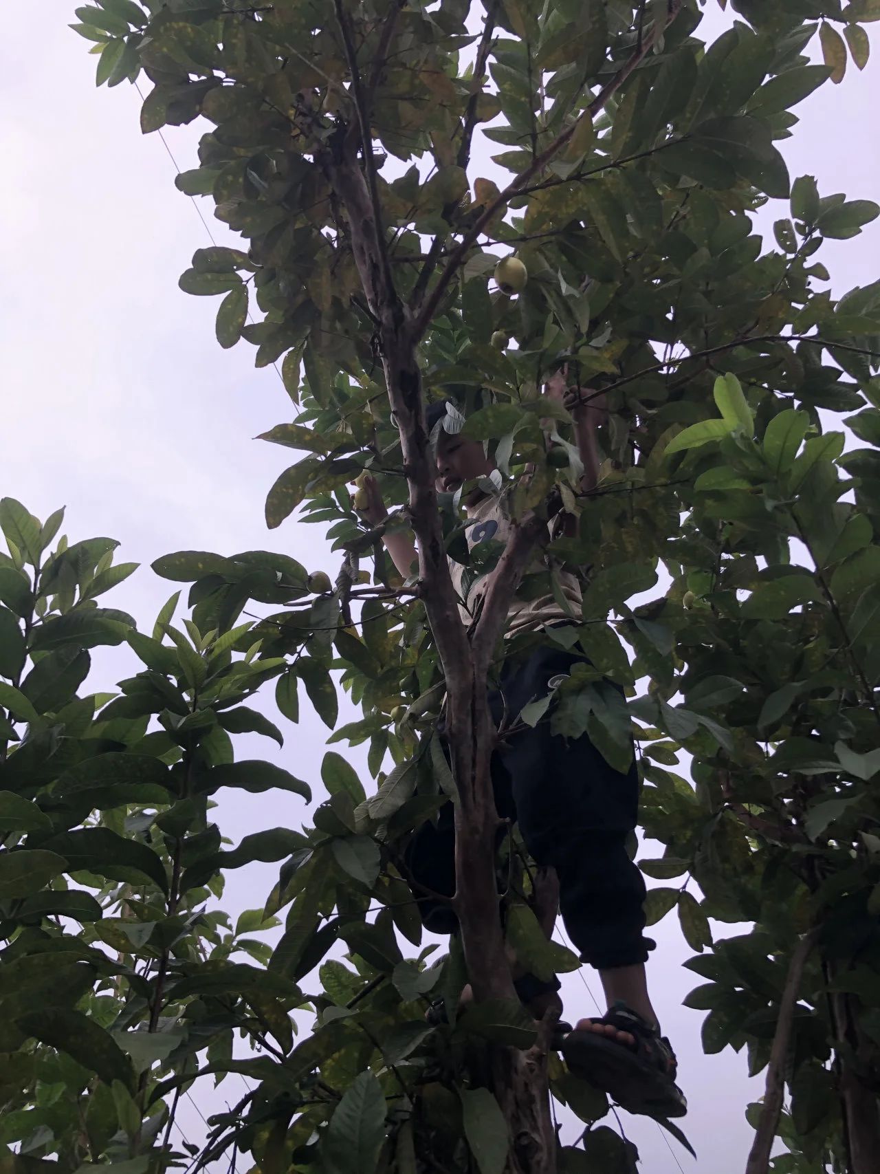 ——家访路上,学生上树摘取水果,热情地和老师分享——