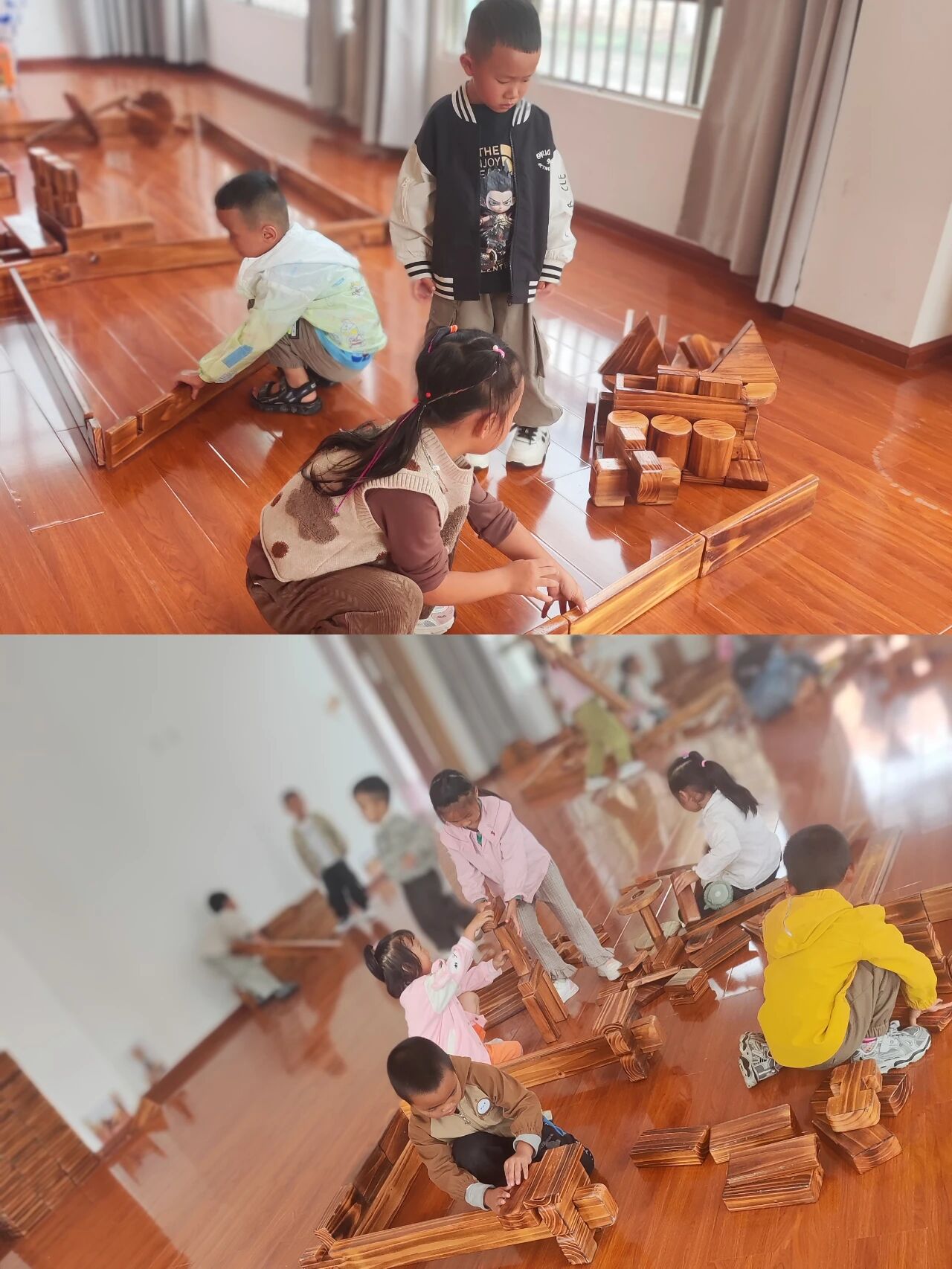 午后,阳光斜斜地洒进积木区,为满地的彩色积木镀上一层温暖的光晕。我领着孩子们来到这里,大班的孩子们或蹲或坐,指尖轻巧地搭接着。有的专注地拼着“城堡”,有的合作搭起“大桥”,偶尔还会听到他们小声地商量:“这儿再加个窗户吧……” 积木碰撞发出清脆的声响,夹杂着孩子们欢快的笑声。不一会儿,一个充满想象力的“小世界”便在光影交织中悄然绽放。