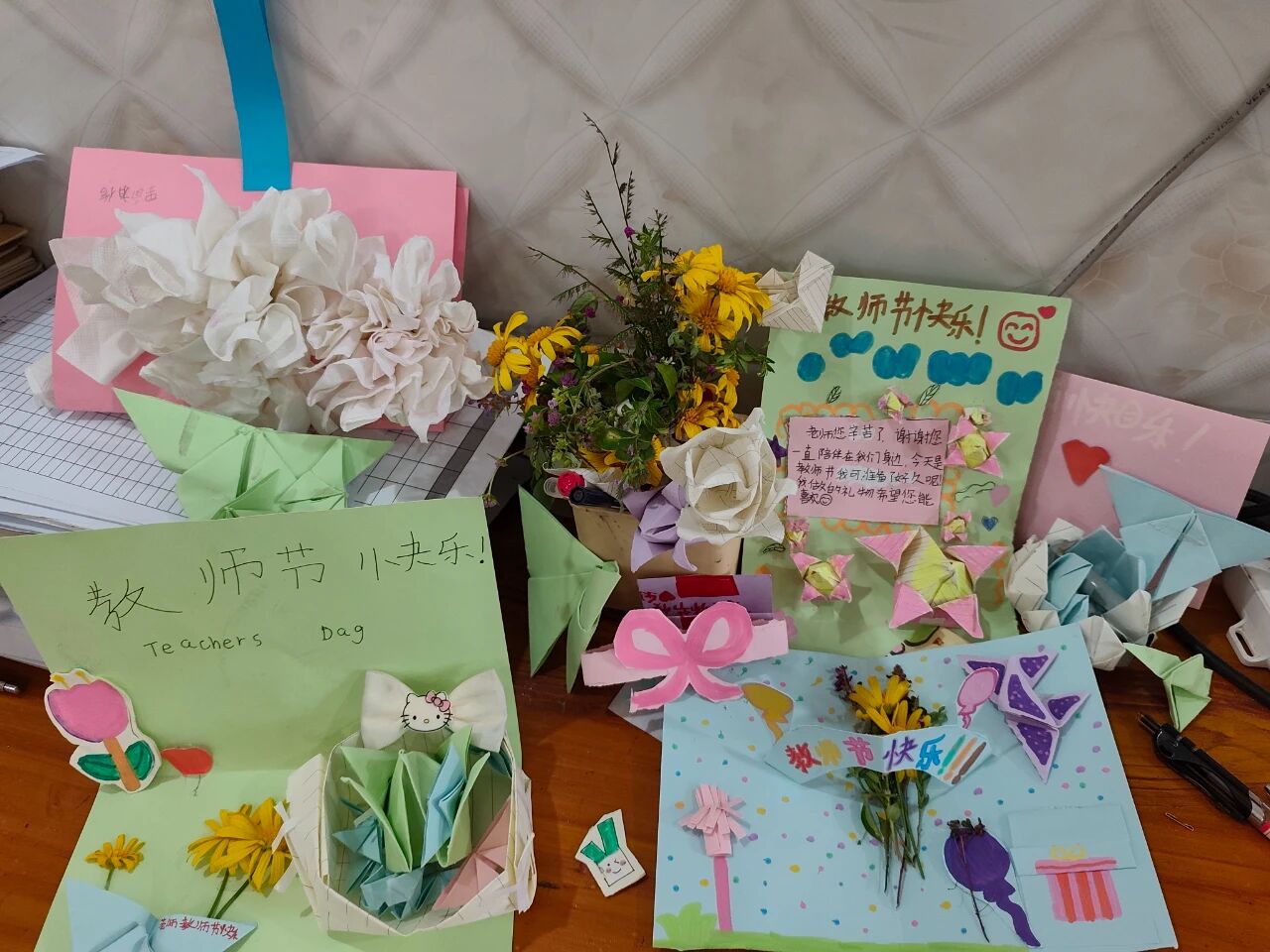 我接过这些沉甸甸的“礼物”,指尖传来野花的微凉与纸鹤的软韧,忽然觉得眼眶发潮......这些礼物没有精美的包装,可每一样都包裹着孩子们最干净的心意。捧着它们,我仿佛看见了那些清晰又模糊的画面:清晨微凉的山雾里,一个小小的身影蹲在路旁,仔细寻找着那朵最特别的野花;课间休息时,孩子们偷偷用草稿纸折纸鹤,小心翼翼地拆了又折,只为折一个最喜爱、最完美的纸鹤……孩子们把最滚烫的心意藏进了一束野花、一只纸鹤、一幅小画里。