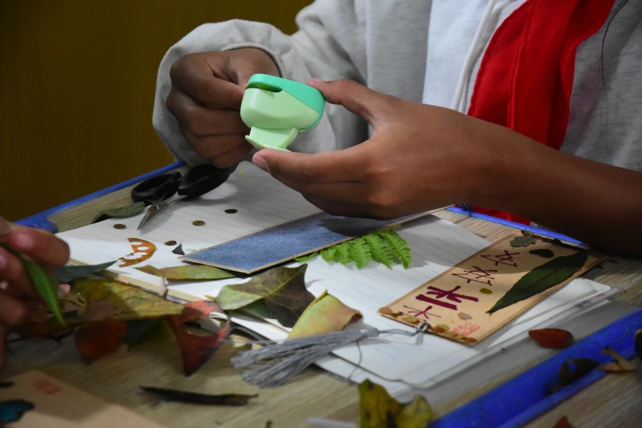 同学们尽情挥洒着想象力与创造力。有人将不同色泽的落叶巧妙拼贴,构成一幅层次丰富的秋日画卷;有人则在书签上认真写下心中的愿望与祝福,让情感随秋叶一同沉淀。每一枚书签,都承载着他们对秋天独一无二的解读,也成为这个季节留给他们最珍贵的纪念。