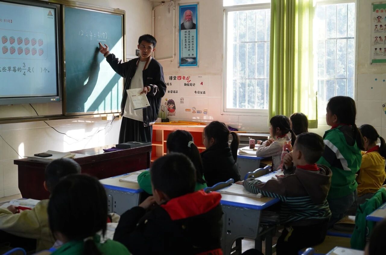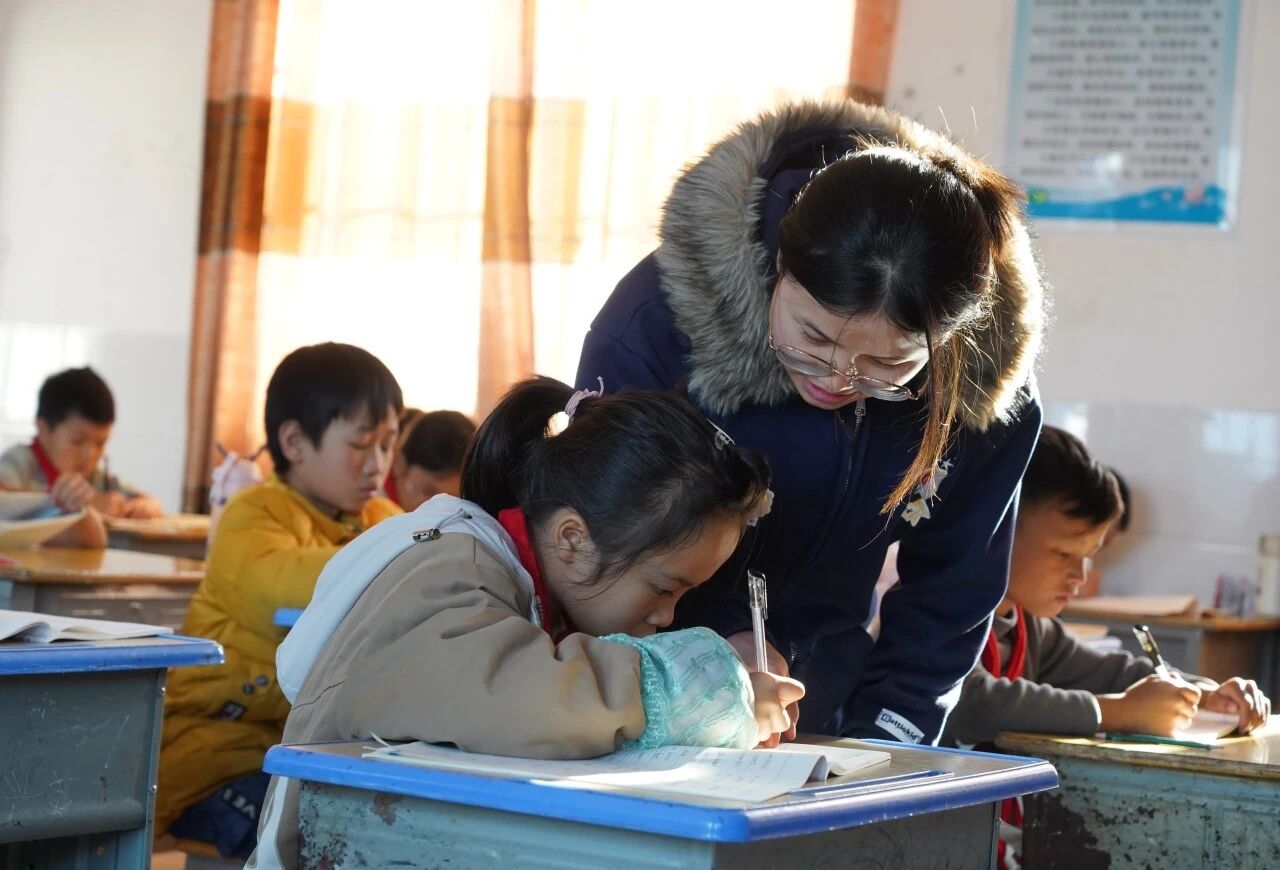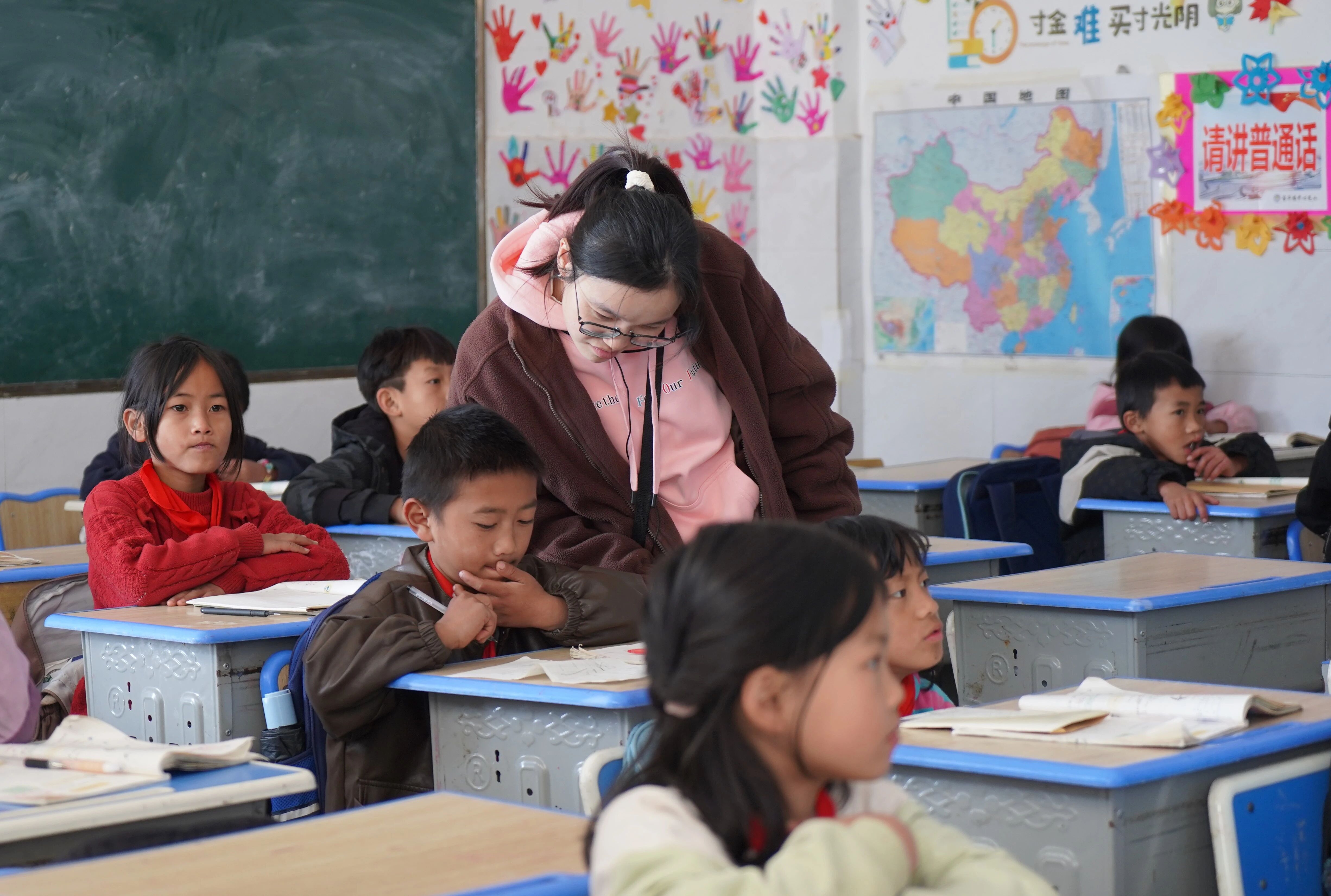 在杨万乡的铜厂小学和新寨小学,我们了解到一段“老带新”的支教故事。新寨小学的李琴老师今年已步入支教第二学年,而九月刚上岗的支教志愿者秦畅和陈铎,还是对校园生活略带懵懂的“新老师”。在李琴的悉心引导下,他们逐渐熟悉了教学节奏,也融入了这片土地上的日常。