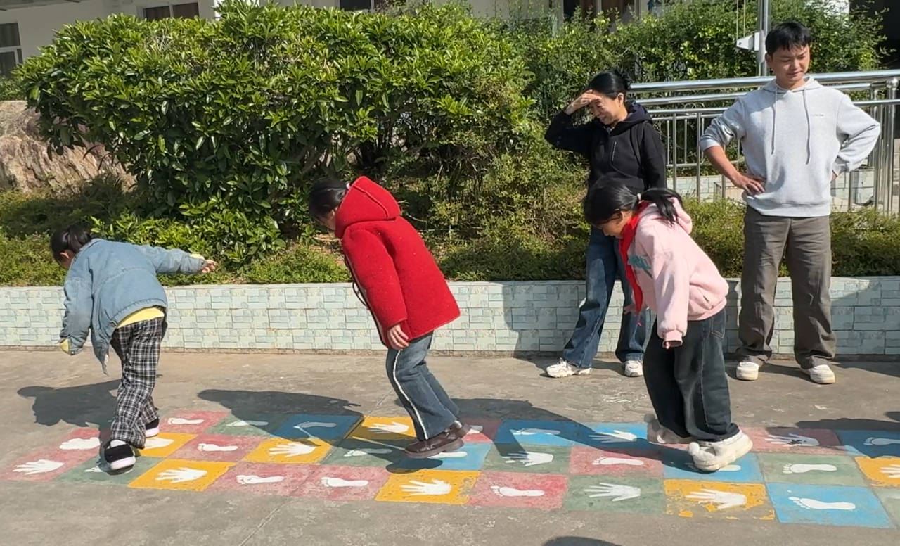 一走进坝子小学,地面的彩绘游戏区便吸引了大家的目光。课间,几名活泼的学生蹦蹦跳跳地跑来,开心地向我们演示起游戏的玩法。