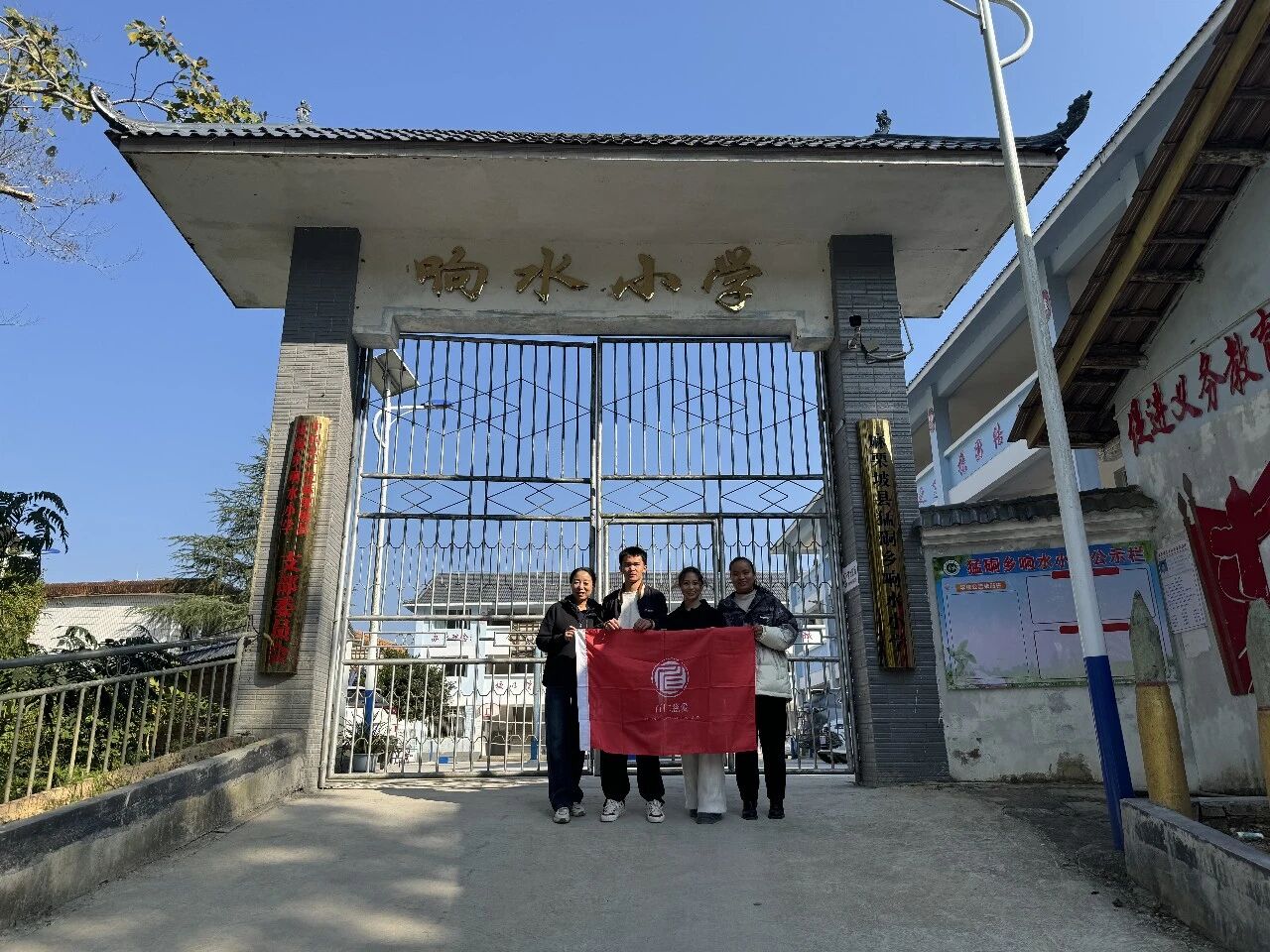 回访团队的首站是云南省红河县的俄垤小学。该校目前共有四位支教志愿者,其中温小秀、李琳为留任教师,龚婉珍和强佳业为本学期新加入的志愿者。在李琳老师的引导下,我们参观了校园。尽管校园不大,但处处可见志愿者们带领学生绘制的生动壁画,为环境增添了盎然生机。